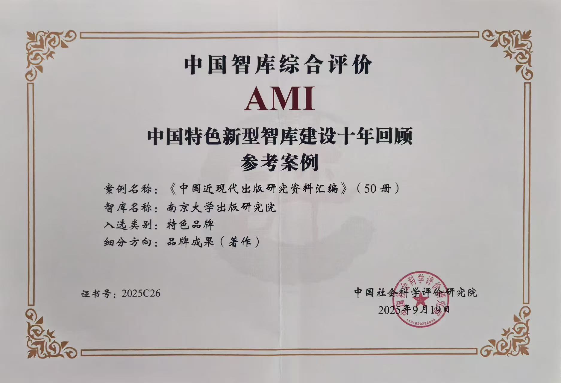 会上公布中国智库综合评价研究项目(2025)评审结果,南京大学出版研究院入选“中国智库综合评价2025年AMI智库”名单,研究院案例“中国近现代出版研究资料汇编(50册)”荣获“中国特色新型智库建设十年回顾参考案例”。