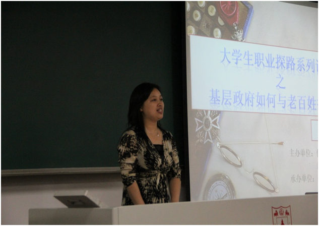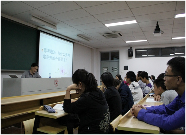 10月10日晚形势与政策课由信息管理系党委副书记罗萍老师主持,并请来了南京市白下区洪武路街道马府街社区党委书记米晅,从基层独特的视角为大一新生们阐述了“如何做人”,特别是“如何做好受老百姓欢迎的人民公仆”。