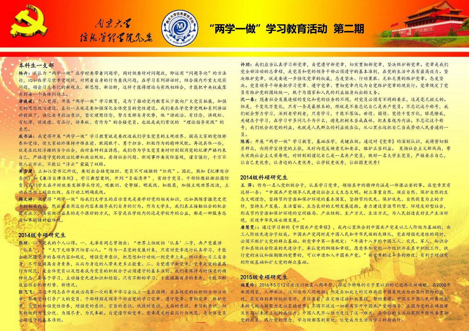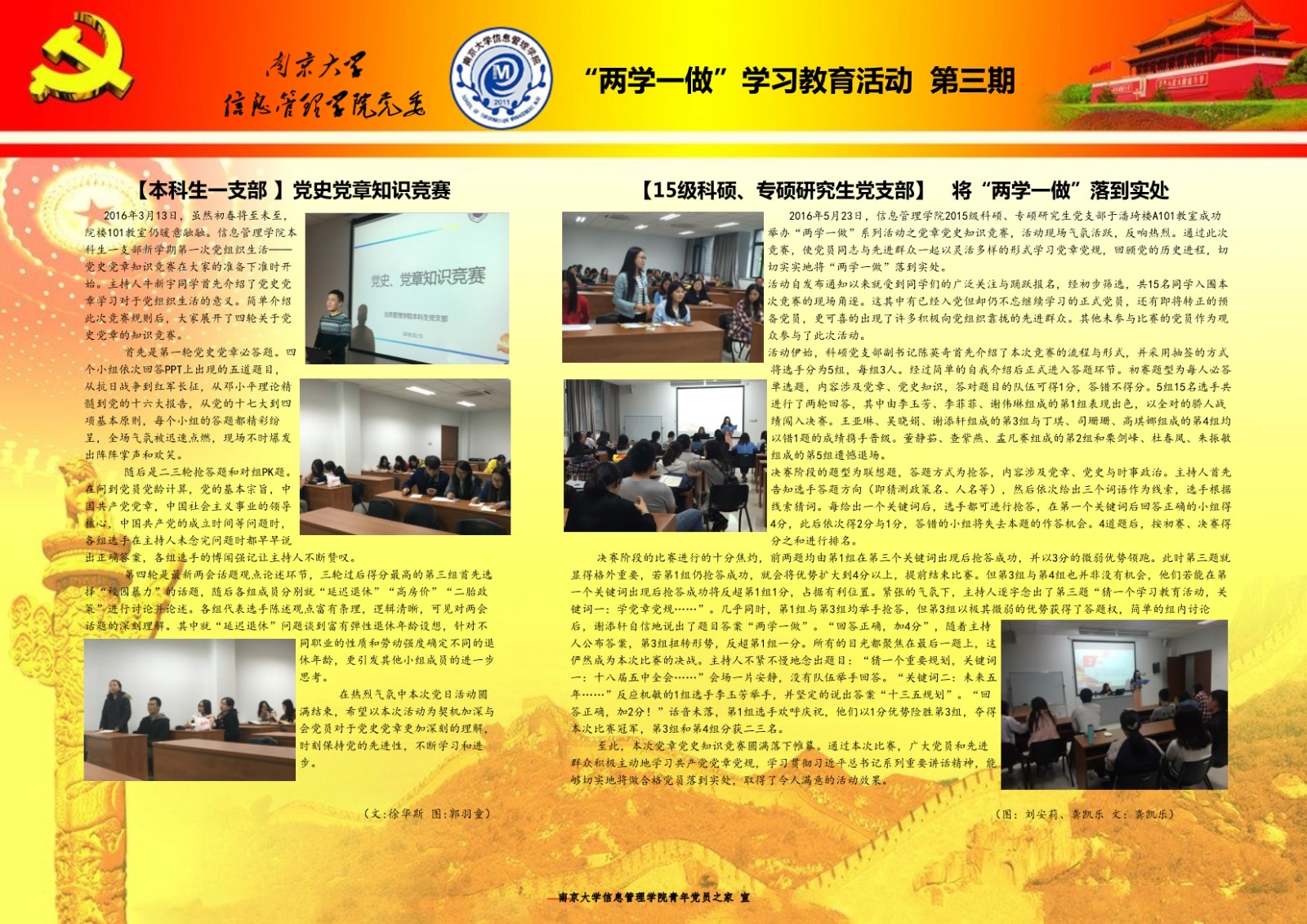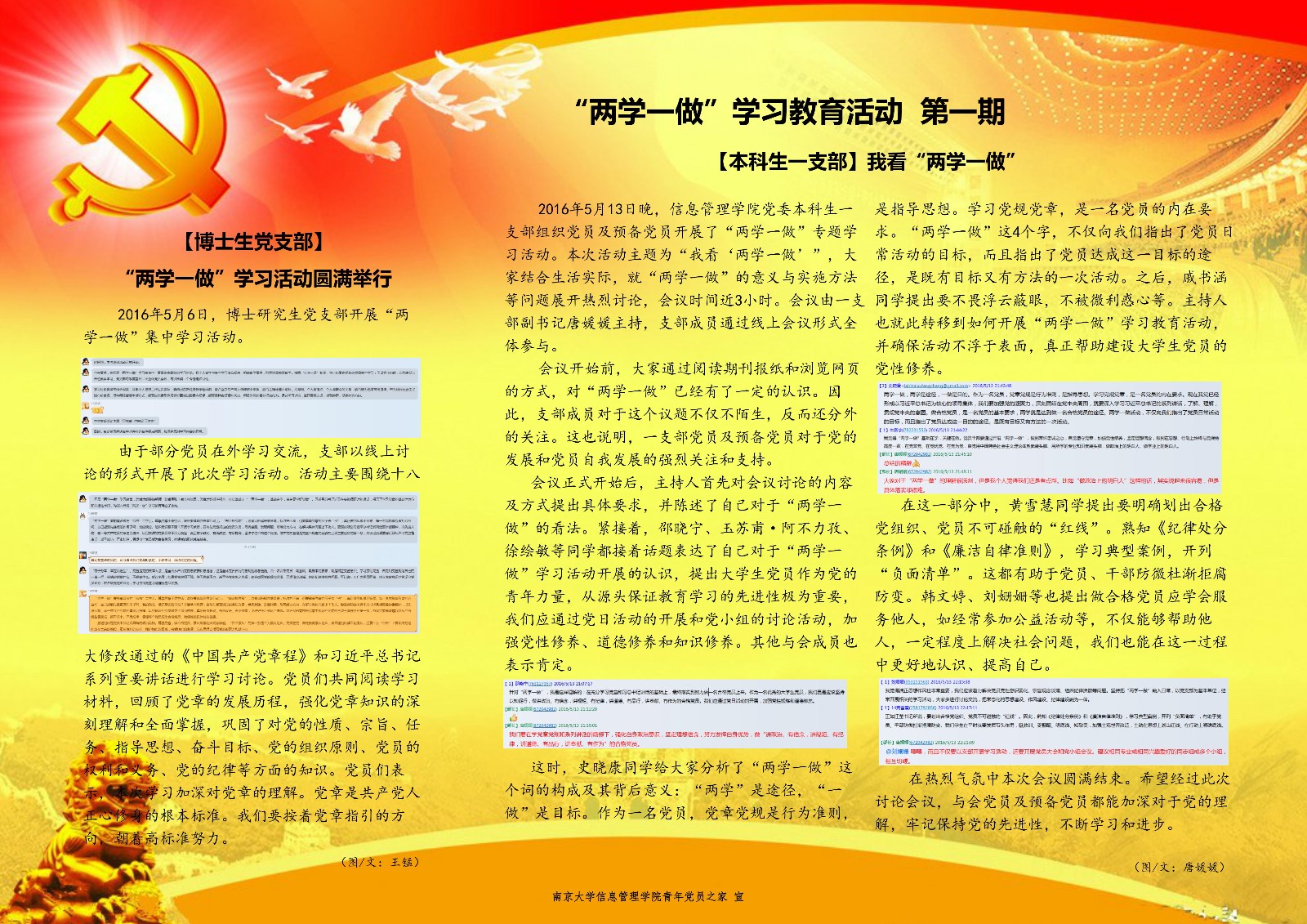 根据学校《方案》要求,时时彩平台 党委在4月底5月初,在全院党员师生中组织开展以“讲政治、有信念”为主要内容的专题学习研讨活动。顺应互联网+的时代背景,院党委鼓励各支部充分利用新媒体,创新学习教育活动形式,做到线上线下良性互动、共同推进,以提高学习实际效果为首要标准。坚持党员师生自学和集体学习相结合。围绕党章党规和习近平总书记系列讲话学习专题,教工党支部4月底专门召开党员大会,开展集中学习;博士生党支部和本科生一支部分别在5月6日和5月13日通过QQ群展开了学习心得的线上交流,2015级专硕党支部与科硕党支部则分别于5月12日和16日在潘琦楼召开了“两学一做”面对面专题分享会。全院党员师生初步了解了“两学一做”学习教育活动的背景意义和主要内容,学习氛围日渐浓厚。