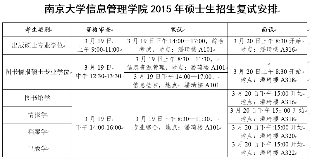 专业学位硕士:笔试时间为图书情报硕士3月19日全天,出版硕士3月19日下午;面试时间均为3月20日上午。