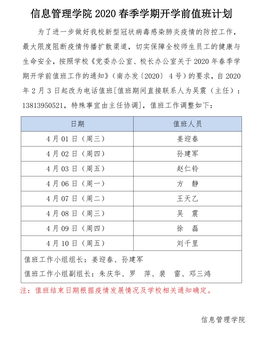在线时时彩平台推荐 2020春季学期开学前值班计划(4月份)