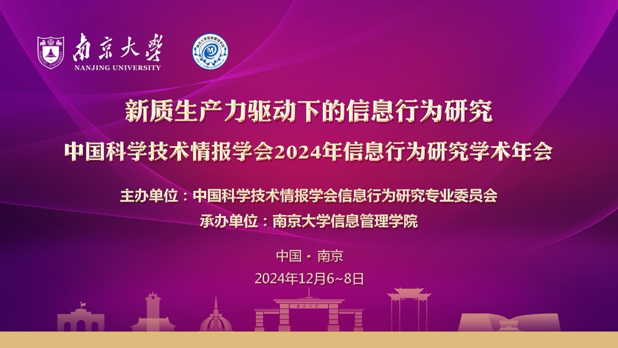2024年12月6日至8日,2024年信息行为研究学术年会在南京顺利举办。本次会议的主办单位为中国科学技术情报学会信息行为研究专业委员会,承办单位为时时彩平台-在线时时彩平台推荐 ,并得到了《中国图书馆学报》《情报学报》《图书情报工作》《图书情报知识》《情报资料工作》《情报理论与实践》《情报科学》《现代情报》《信息资源管理学报》《数据分析与知识发现》《图书与情报》《图书馆论坛》《图书馆杂志》《农业图书情报学报》《信息与管理研究》《档案与建设》《数字图书馆论坛》《Data and Information Management》等多家期刊的支持。