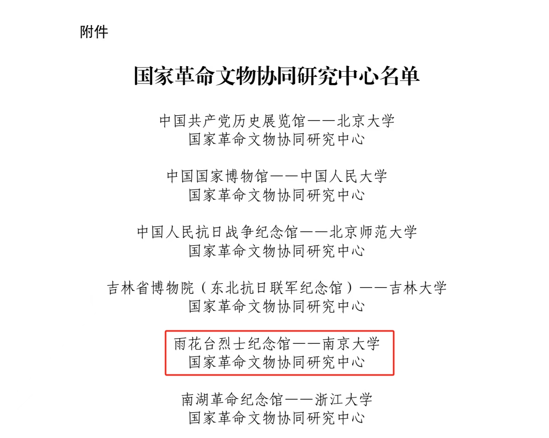 3月14日上午,教育部、国家文物局公布了“国家革命文物协同研究中心”名单,南京大学和雨花台烈士纪念馆牵头组建的“雨花台烈士纪念馆—南京大学国家革命文物协同研究中心”成功入选首批20个国家革命文物协同研究中心。这是我校继2023年成功入选四部委“铸牢中华民族共同体意识研究基地”之后,又一被列入按照教育部人文社会科学重点研究基地管理的平台。