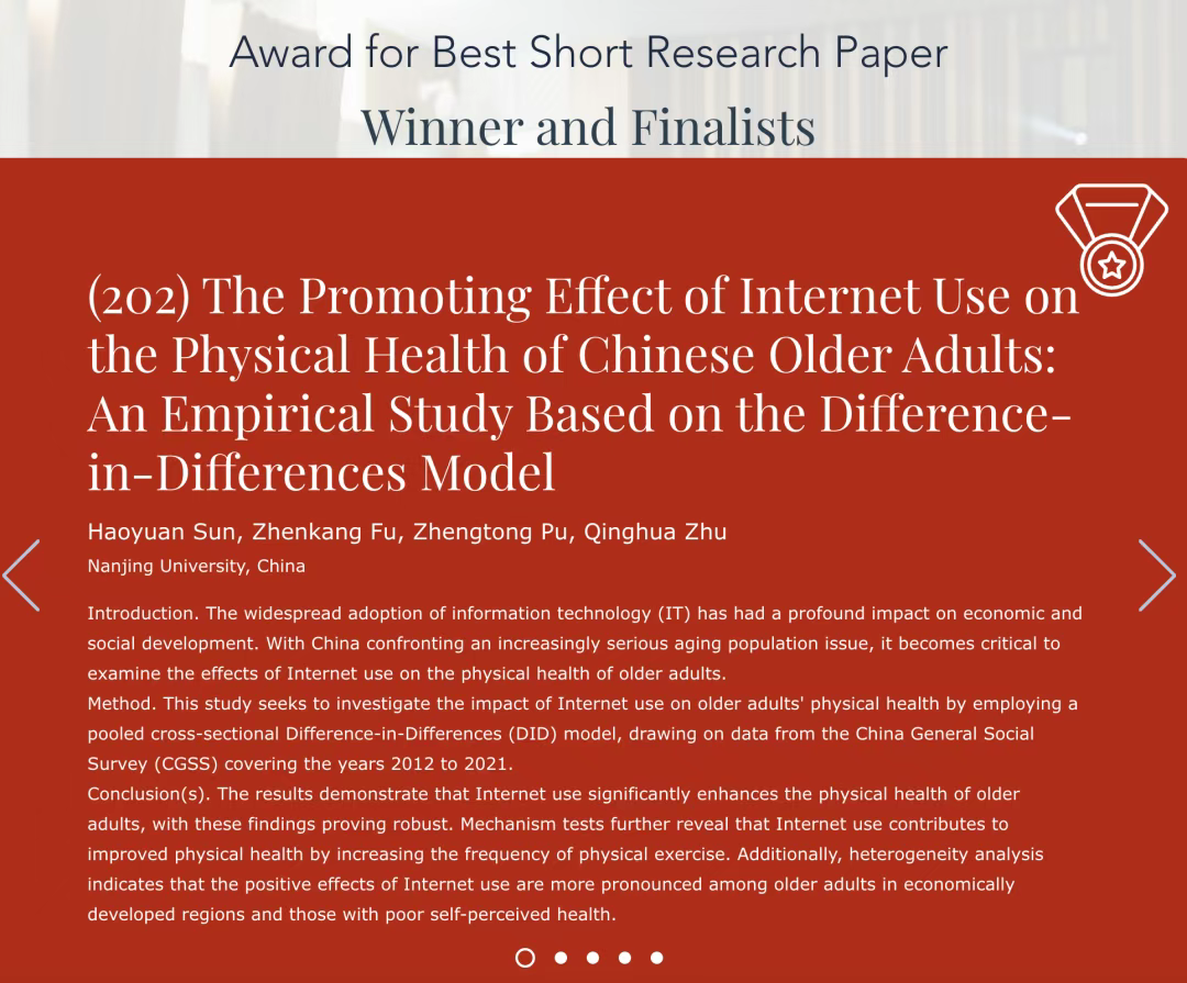 该获奖论文利用双重差分模型探究互联网使用对身体健康的促进作用。这一成果为推动老年人健康生活方 式提供了理论支持,也为信息科学与技术在健康领域的应用提供了新思路。