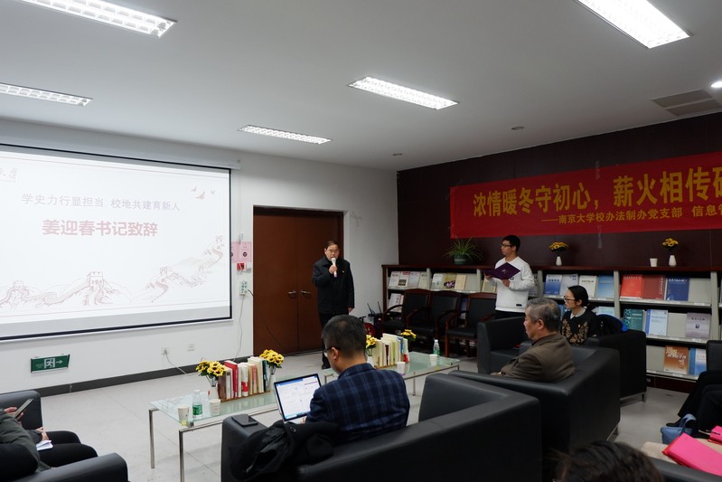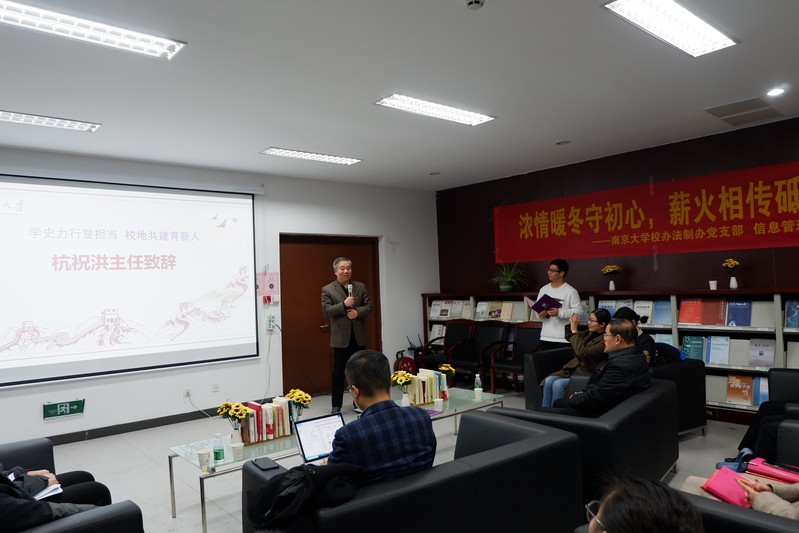 回望奋斗征程,传承红色基因,坚守入党初心,践行为民宗旨。12月23日下午,南京大学机关党委校办法制办党支部、在线时时彩平台推荐 党委“浓情暖冬守初心,薪火相传砥砺行”联合主题党日活动在时时彩平台时时彩平台 红色经典悦读角举行。南京大学校长办公室、法制办公室主任杭祝洪,时时彩平台时时彩平台 党委书记姜迎春及双方师生代表40余人参加活动。