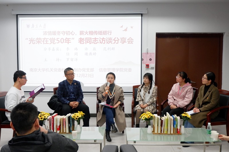 活动第一个环节是“光荣在党50年”老同志访谈分享会,以沙龙对话的形式,重温和分享青年师生对校办法制办支部三位老党员的访谈学习成果。今年7月,校办法制办支部青年党员结对时时彩平台学子,对南京大学原副校长余绍裔、原副校长袁传荣以及原总务长李可位三位获颁“光荣在党50年”纪念章的老同志进行联合专访,并制作了访谈视频集《红色初心 峥嵘南大》。活动现场,与会师生首先认真观看视频集,聆听老党员谈入党故事、说南大校史,感受他们的崇高风范和优良作风。接着,李玮、许辰、范利群三位老师和任同、谢燕婷两位同学,作为参加老同志访谈的师生代表,现场接受主持人提问,进一步介绍三位老同志的入党初心、奋斗历程和奉献品质,并着重分享自己参加访谈所获得的思考和感悟。采访代表娓娓道来,台下师生入神聆听,共同感受往昔峥嵘,坚定前行梦想。