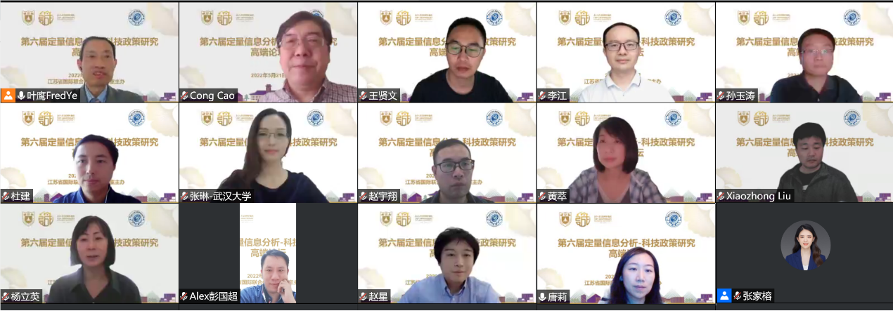 2022年5月21日,由江苏省国际联合信息学实验室、时时彩平台-在线时时彩平台推荐 主办的第六届定量信息分析-科技政策研究高端论坛在线成功举行。论坛是庆祝南京大学建校120周年系列活动之一,由南京大学叶鹰教授主持,12位来自国内外知名高校的专家学者进行了精彩纷呈的研究交流,宁波诺丁汉大学的曹聪教授对论坛进行了点评。近400名观众云端参加了论坛。