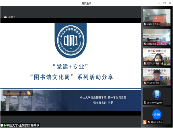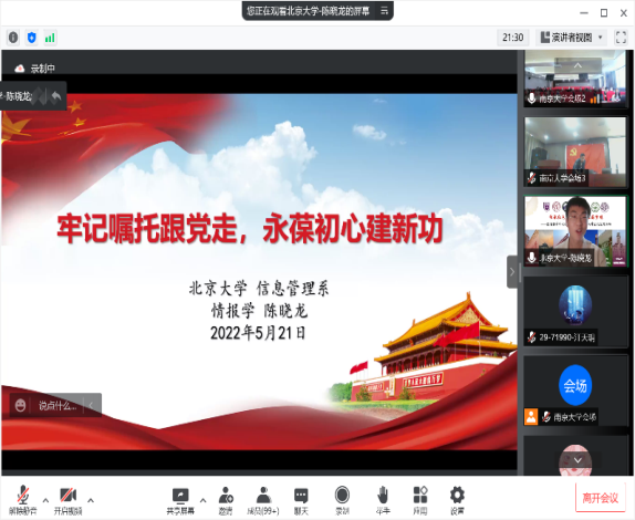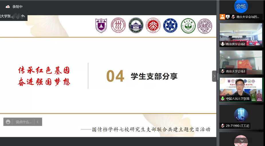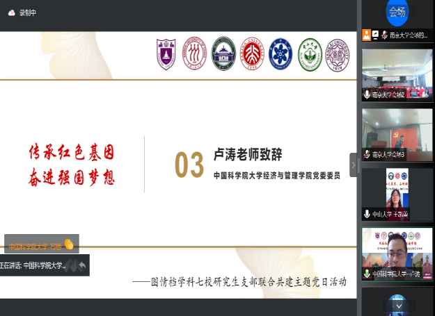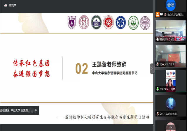 为深入学习贯彻习近平总书记4月25日在中国人民大学考察调研时重要讲话精神、学习总书记5月18日给南京大学留学归国青年学者的回信精神,时时彩平台-在线时时彩平台推荐 2021级图书情报硕士第一党支部、中国人民大学信息资源管理时时彩平台 2021级硕士2班3班联合党支部、北京大学信息管理系硕士生党支部、武汉大学在线时时彩平台推荐 情报学硕士研究生党支部、中山大学在线时时彩平台推荐 第一学生党支部、中国科时时彩平台 大学经济与管理时时彩平台 991党支部和南开大学商时时彩平台 工程图情专硕党支部等图情档学科七校研究生党支部,于5月21日联合开展以“传承红色基因,奋进强国梦想”为主题的“云上”联学联建活动。来自全国天南海北的200余位青年学子,围绕图情档学科如何在弘扬留学报国传统、赓续红色血脉、坚定文化自信、讲好中国故事等方面发挥积极作用展开真诚而热烈的隔空对话。时时彩平台-在线时时彩平台推荐 党委书记姜迎春老师、副书记罗萍老师,中山大学在线时时彩平台推荐 党委副书记王凯蕾老师,中国科时时彩平台 大学经济与管理时时彩平台 党委委员卢涛老师参与活动。