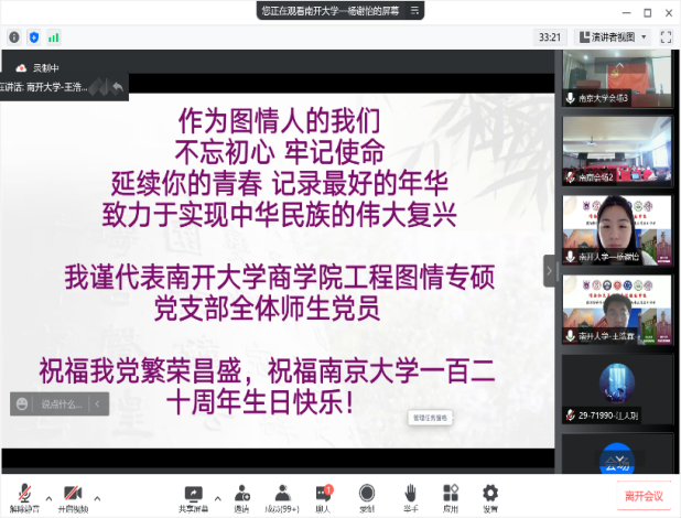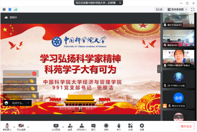 “传承红色基因,奋进强国梦想”联学联建活动,开展了跨地区、跨院校、跨支部的党建交流与科研工作分享,探索疫情防控常态化下高校学生党建工作新形式,增进了合作,加深了友谊。恰逢南京大学建校120周年华诞,与会各校学生代表也献上了对南京大学的美好祝福。活动在温馨的云端合影中顺利结束。