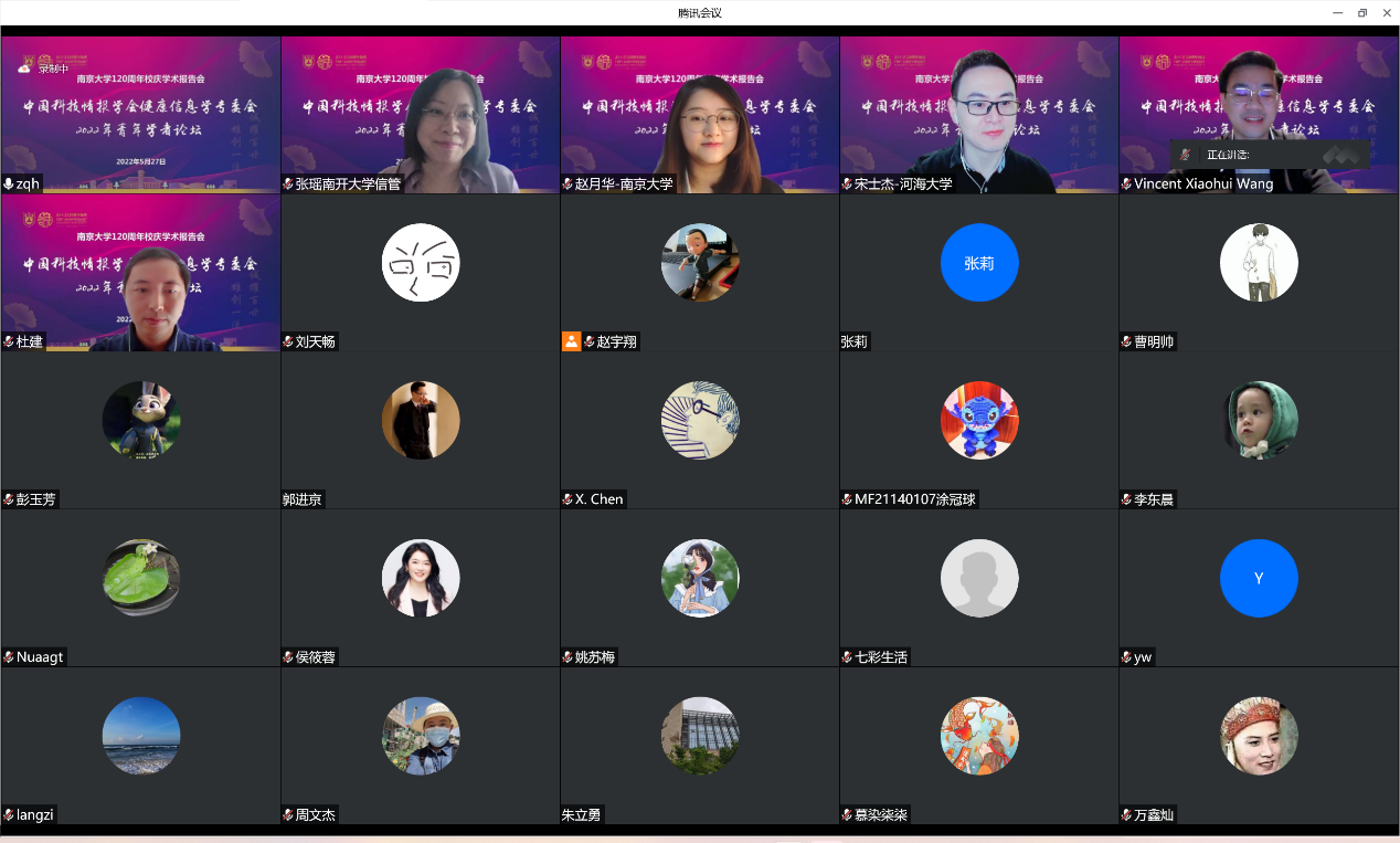 2022年5月27日,由中国科技情报学会健康信息学专委会和时时彩平台-在线时时彩平台推荐 联合主办的南京大学120周年校庆系列学术报告会健康信息学青年学者论坛专场顺利举行。本次论坛是自健康信息学专委会去年6月份成立以来第一次举办青年学者论坛,论坛主题聚焦于健康信息学的新领域和新方向。在祝贺南京大学120周年华诞的同时,5位青年才俊分享了各自研究的最新进展,200余名观众在云端参加了论坛,共同对健康信息学的相关研究内容进行交流探讨。