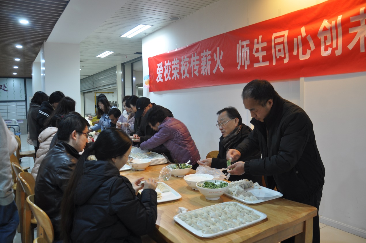 座谈会结束后,师生们在食堂开展了迎冬至包饺子活动,余绍裔同志的“英文秀”、老同志们包饺子的绝活一次次把气氛推向高潮,笑容和自信洋溢在每个人的脸上。