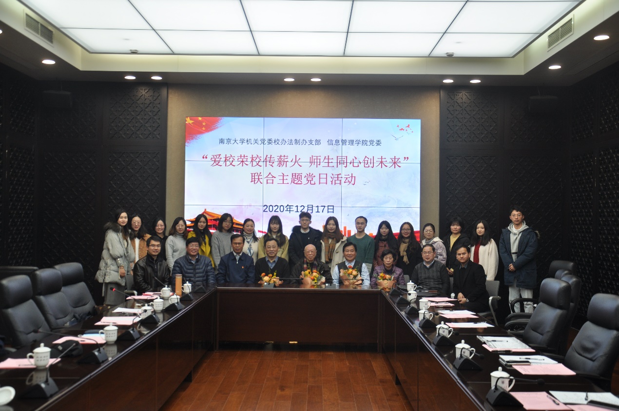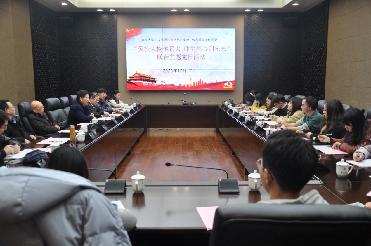 南京大学校长办公室、法制办公室主任,校办法制办党支部书记尹三洪同志首先介绍了此次联合主题党日活动的意义和目的。他指出,离退休同志长期受党的教育,是学校和国家建设发展历程的见证者、参与者和奉献者。发挥老同志、老专家的思想优势、阅历优势、经验优势,讲述中国故事、南大故事和身边故事,是深入开展“学四史、知校史”学习教育活动的应有之义。他寄语青年党员传承各位前辈的奋斗精神,汲取他们的经验智慧,进一步增强守初心、担使命的思想自觉和行动自觉,努力以青春之我创造青春之南大,以个人之梦托起南大梦,以南大梦托起中国梦,真正实现“今日我以南大为荣,明日南大以我为荣”的理想和使命。