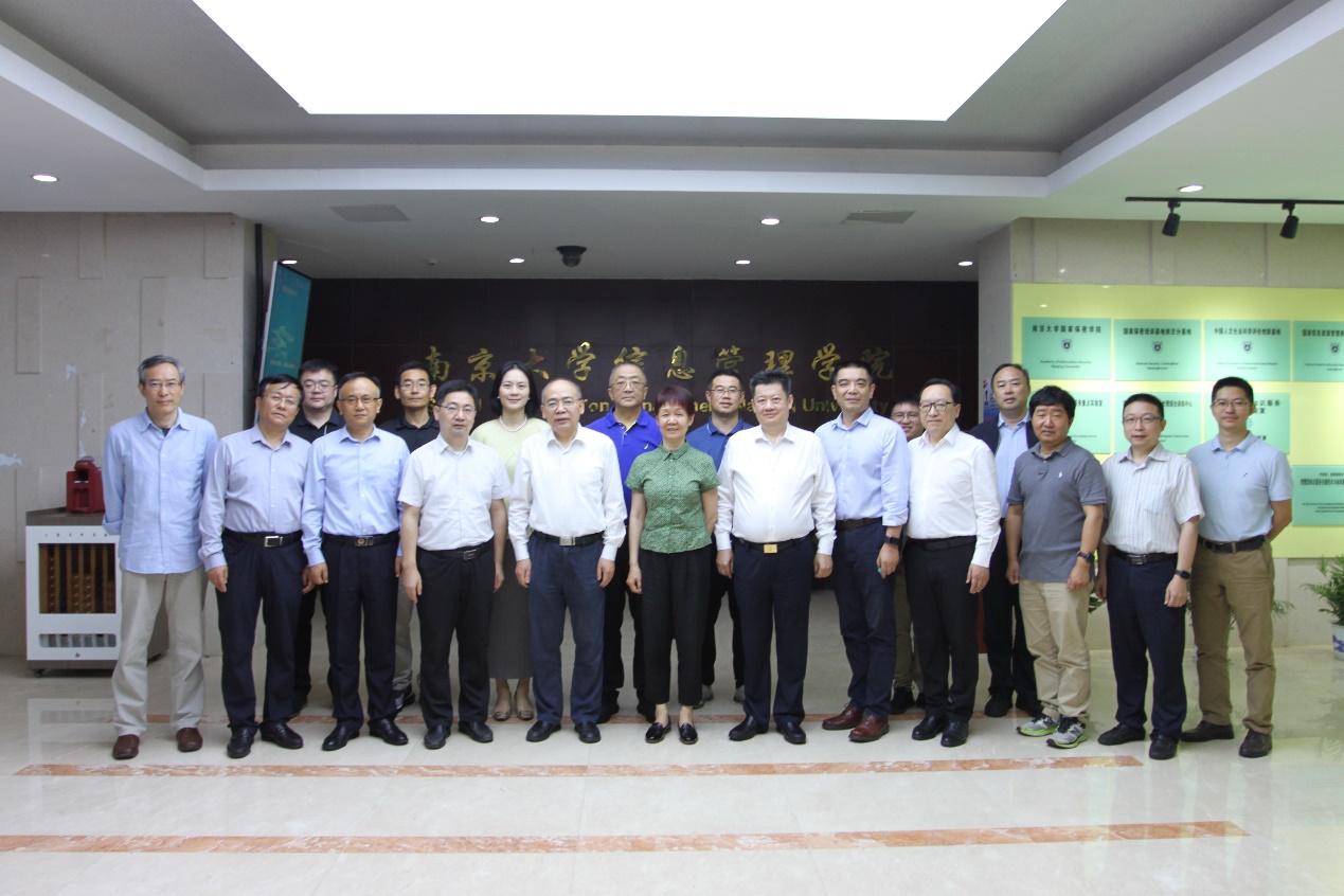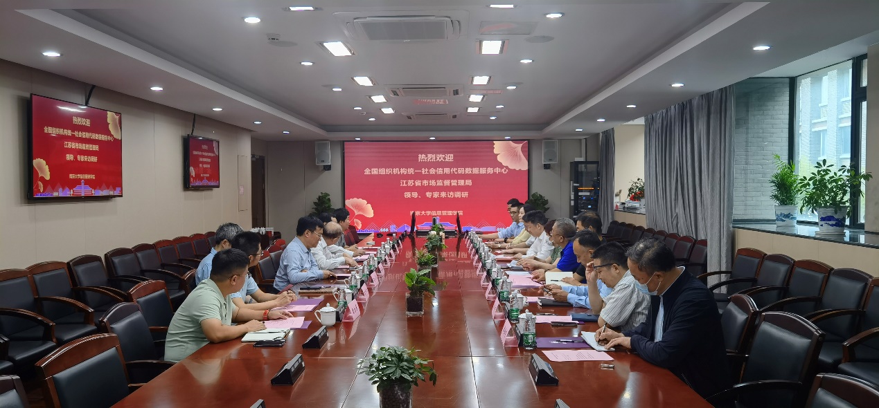 8月31日,全国组织机构统一社会信用代码数据服务中心党委书记、副主任马思宇,江苏省市场监督管理局一级巡视员冯新南一行围绕统一社会信用代码的政产学研赴南京大学调研,听取在线时时彩平台推荐 有关大数据与创新应用的汇报,江苏省市场监督管理局有关部门领导陪同。